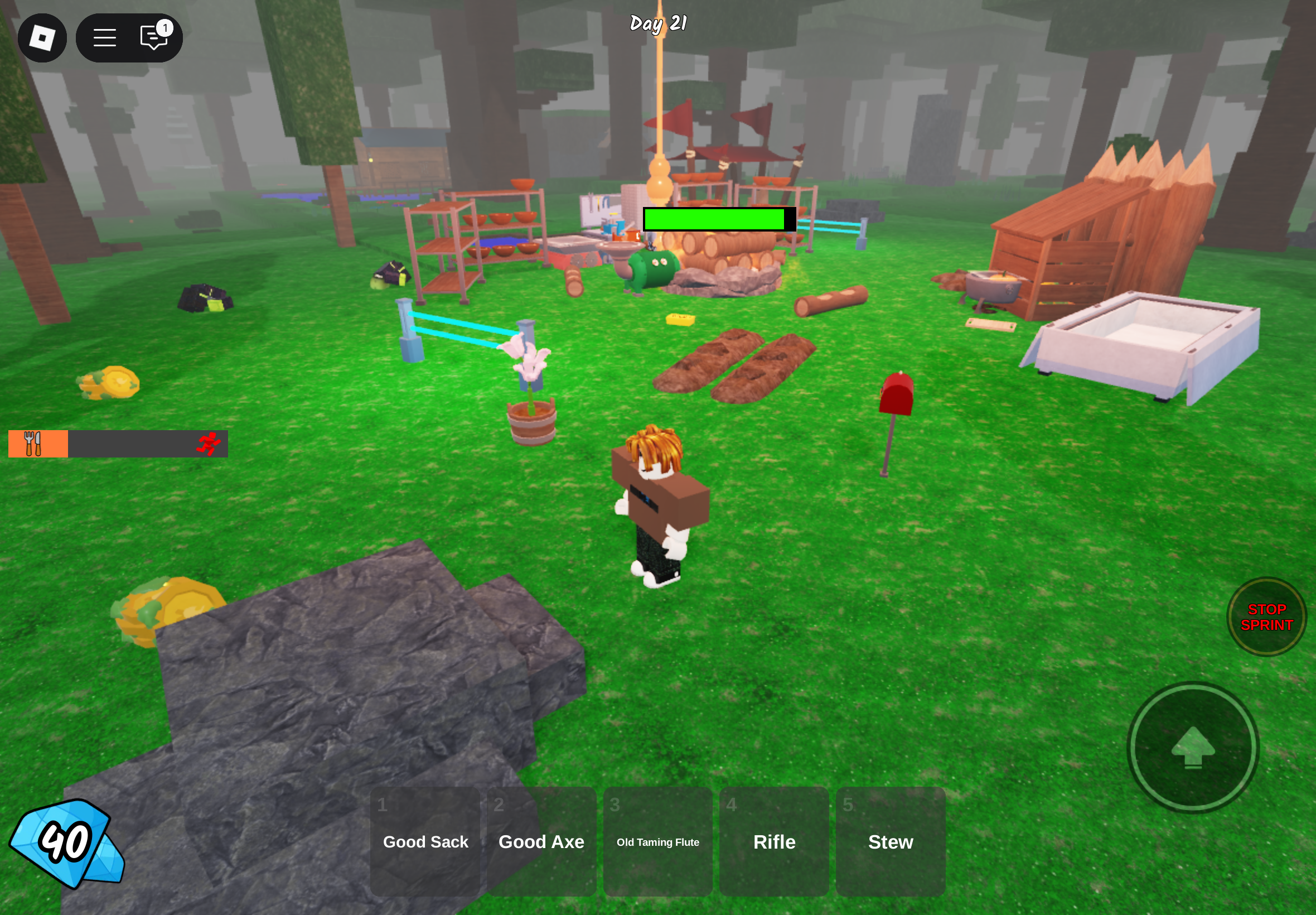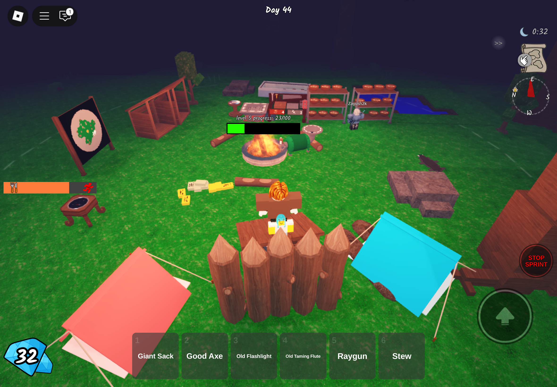 Играем с Мишей, цель — добывать ресурсы днём и спасаться у костра ночью, отбиваться от врагов, и вот пара наших баз.